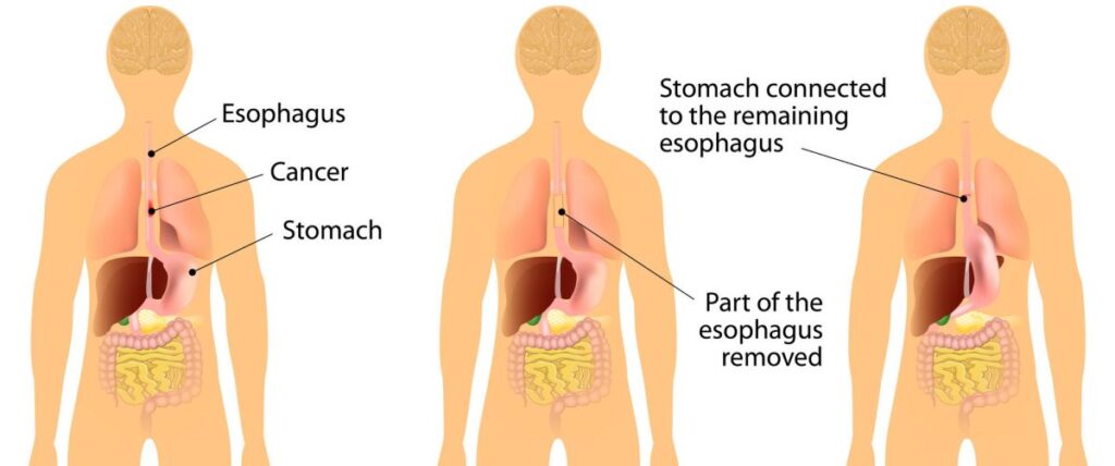 - Surgery (Esophagectomy) – Removal of the affected part of the esophagus, often combined with stomach reconstruction.